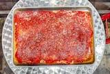 Our 72-hour cold-fermented dough is shaped, proofed, and pan-cooked for a springy, porous, crunchy, chewy, and elevated crumb structure. It is then topped with low-moisture mozzarella, our vine-ripened plum tomato sauce ON TOP OF THE CHEESE, and aged imported and freshly grated Pecorino-Romano cheese.